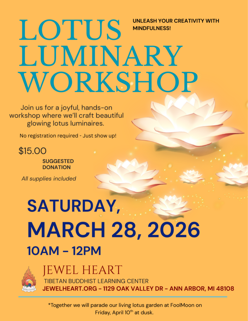 In addition to what Jewel Heart International offers, the Ann Arbor Chapter provides weekly talks and meditations onsite. Throughout the year we hold local courses, host guest speakers, conduct workshops, and hold retreats geared to help individuals bring peace, joy, and understanding into their lives and the lives of others. Jewel Heart offerings are based on the authentic Tibetan Buddhist teachings of Demo Rinpoche, Jewel Heart’s Resident Spiritual Director and the late Kyabje Gelek Rimpoche, founder of Jewel Heart.