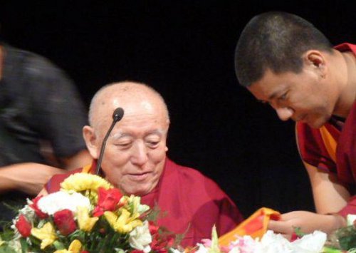November 21, 2011 - Gelek Rimpoche was greeted by many monks and resounding trumpets before giving teachings and the oral transmission of Ganden Lhagyema at Dupthop Rinpoche's Monastery.